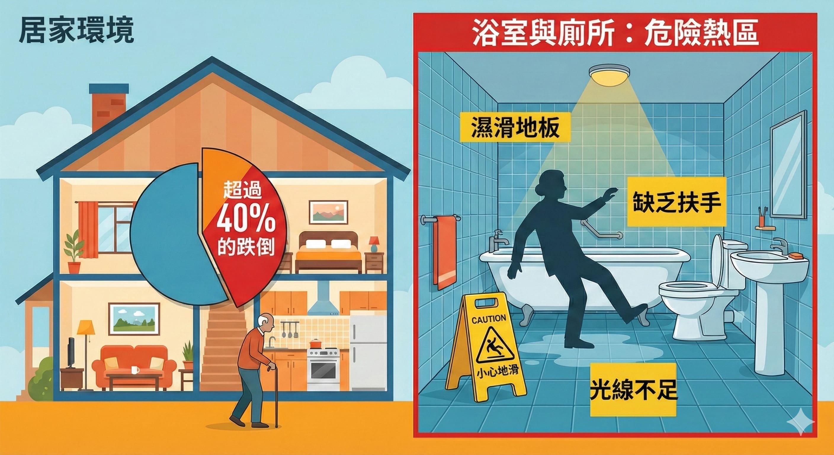浴室,是家中發生跌倒意外頻率最高的地方。根據衛福部統計,65 歲以上長者的跌倒事故,有超過 40% 發生在居家環境,其中「浴室」與「廁所」更是危險熱區。
